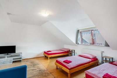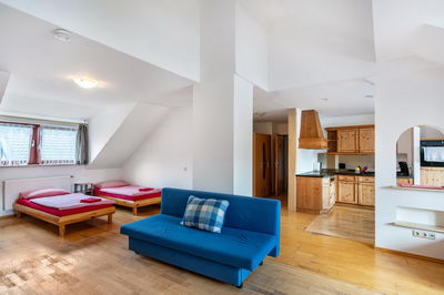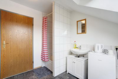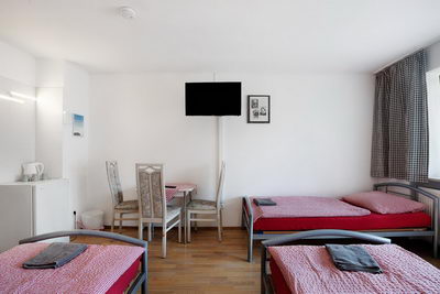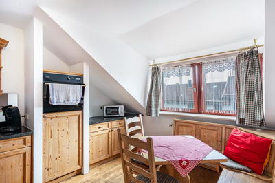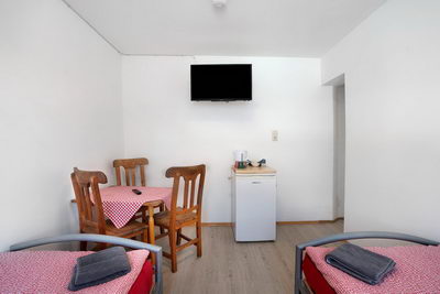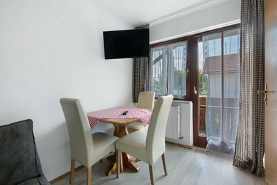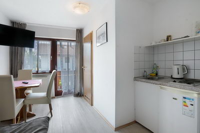 Einige Zimmer und Appartements sind mit Kochnischen ausgestattet, für die anderen Zimmer steht eine kleine Kitchenette im 1. OG mit Kühlschrank, Mikrowelle, Kaffeemaschine und Wasserkocher zur Verfügung.